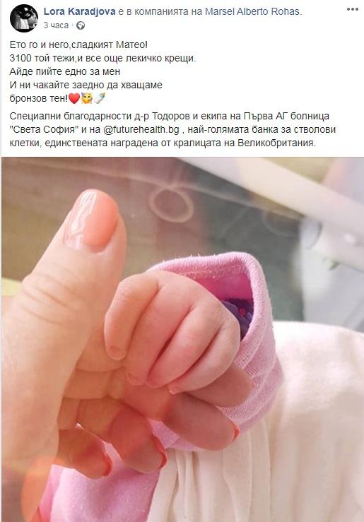 Щастливата новина съобщи във Facebook певицата, като сподели и името на новия член на семейството. Синът ѝ се казва Матео. Това е второто ѝ дете - първото е момиченце на име Алиса.